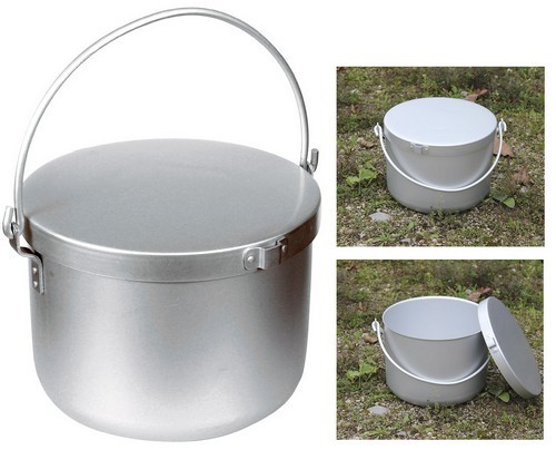 12,5l, Aluminiumtopf, mit Aluminiumdeckel der auch als Bratpfanne genutzt werden kann. Der Henkel rastet vertikal ein. Materialstärke ca. 1,6 – 1,8 mm